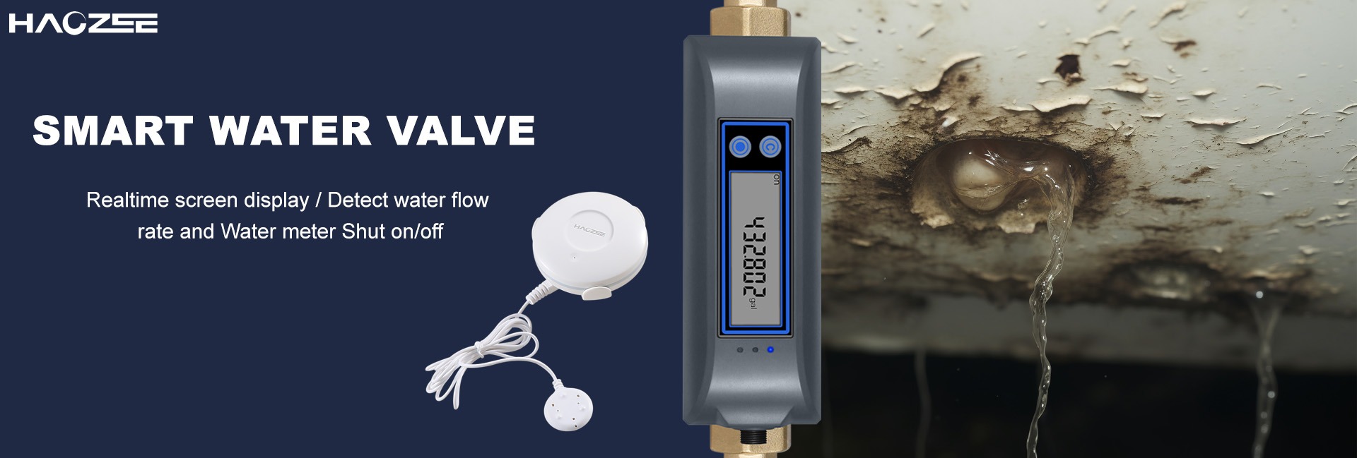 Válvula de agua inteligente Haozee WiFi y tasa de flujo de agua de cierre automático batería recargable integrada para 3/4 pulgadas 1 pulgada de diámetro